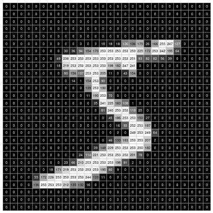 This idea of a “moving average” isn’t limited to one dimensional data; it can be applied to data in any dimension. For example, suppose our data is an image represented by a \(28\times 28\) array of numbers between \(0\) and \(255\). Each array cell is a pixel, and the number is how dark that pixel is, from white (255) to black (0).