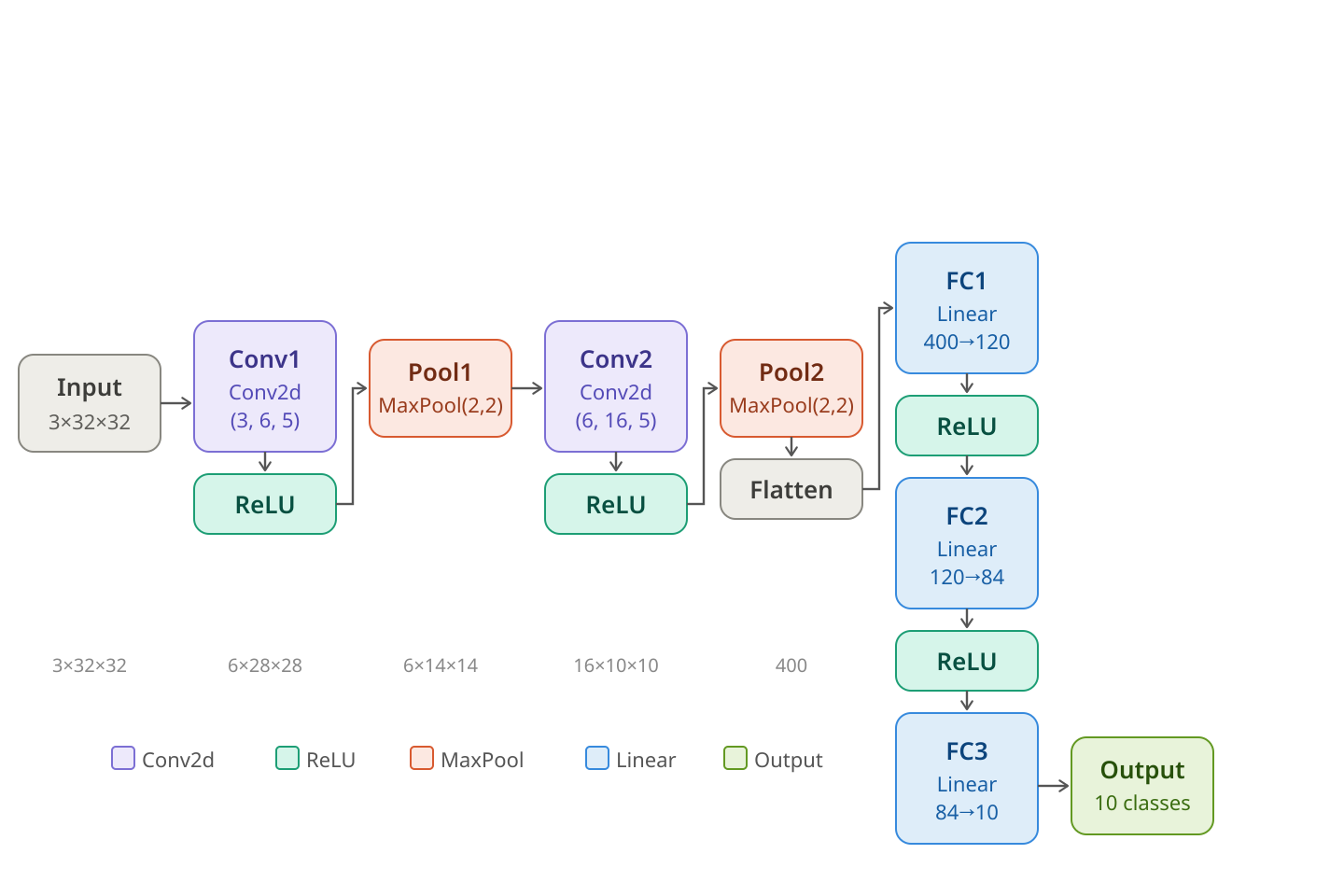 In figure Figure 9.13, we show the architecture of a neural network that does a very good job of classifying the images in the CIFAR-10 database. The network is taken from the pytorch documentation (see Training a Classifier); the graphic was drawn by Claude.