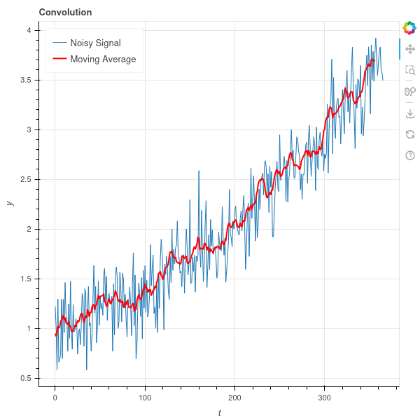 Convolution is essentially a generalization of the moving average, where replace the simple average with an arbitrary weighted average. That is, we take another function \(h(t)\), which we think of as a “filter”, and we use the values of \(h\) to weight the values of \(f\) in our average. The transform of \(f\) under this type of convolution is written \(h\star f\), and in the general continuous case it’s an integral: \[ (h\star f)(t) = \int_{s=-\infty}^{\infty}\sum h(s)f(t-s) dt \]