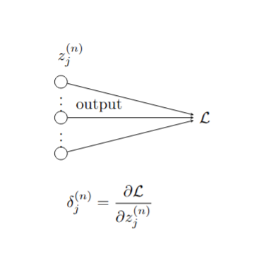 The first step of the backpropagation algorithm comes from the output layer of the neural network. The elements of the last layer \(z^{(n)}\) are fed directly into the loss function \(L_{W}\) as shown in Figure 9.6. Therefore, \[ \delta^{(n)}_j = \frac{\partial L_{W}}{\partial z^{(n)}_{j}} \] depends on the loss function \(L_{W}\). Let’s look at the two cases we considered above separately.